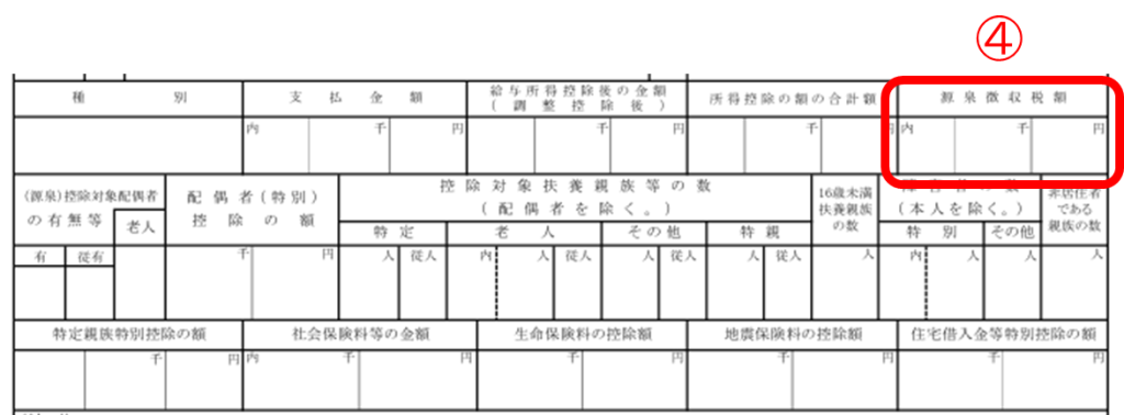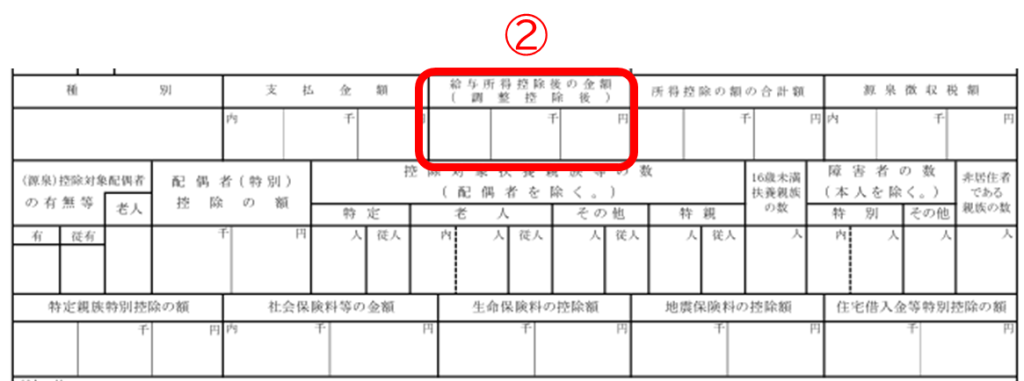 給与所得控除後の金額(②)には、支払金額(①)から年収に応じた給与所得控除額が差し引かれた金額が記載されています。